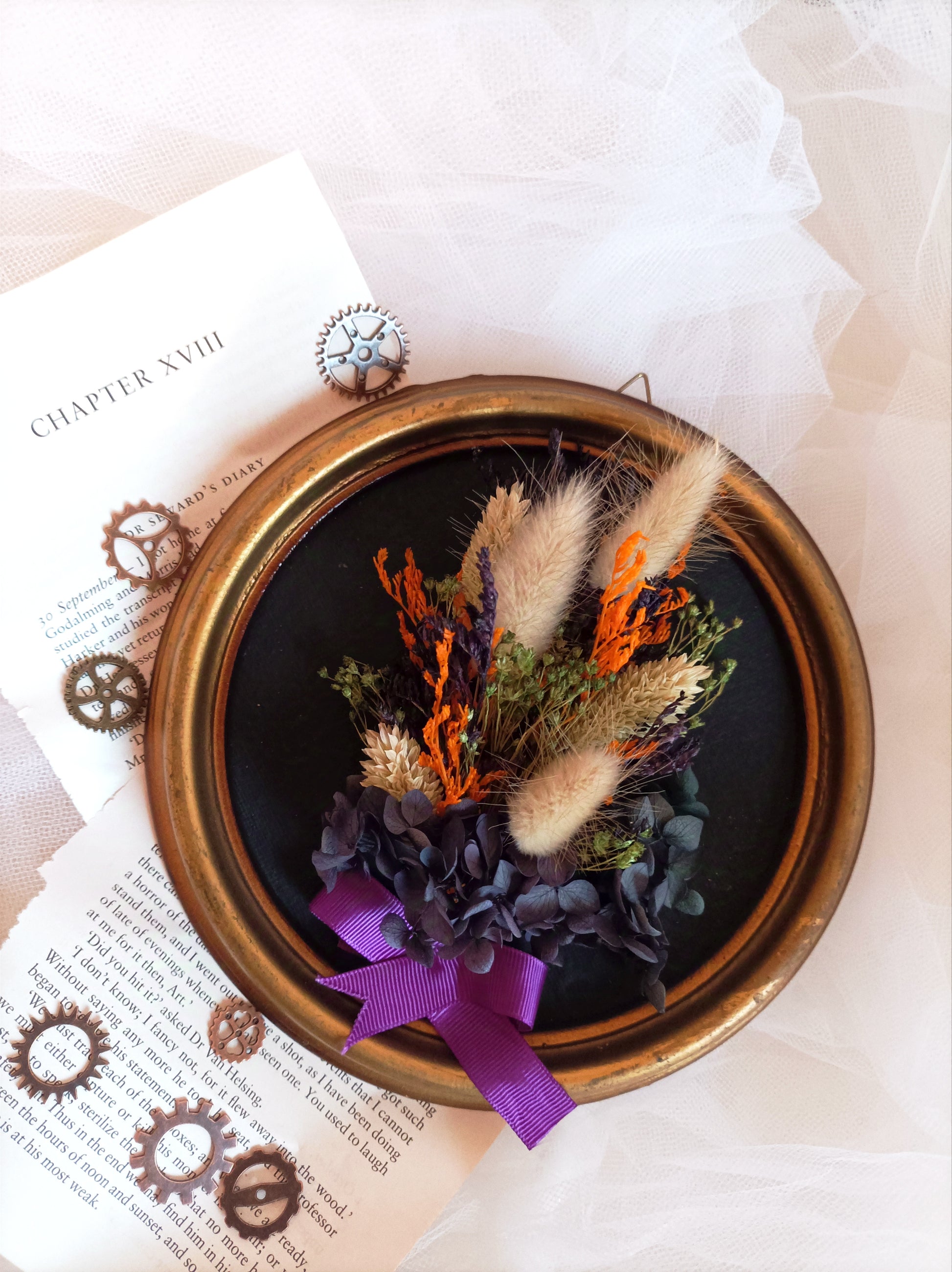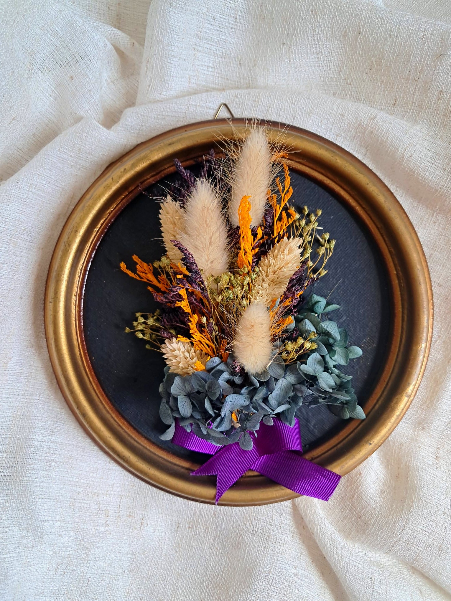 Un cadre rond qui a été retravaillé pour une seconde vie. Il s'orne désormais d'un bouquet de fleurs séchées aux teintes colorées originales.