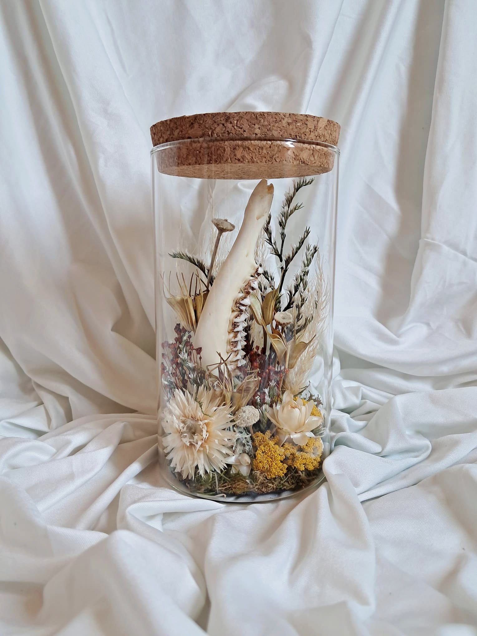 Ce pot en verre contient des fleurs séchées et une mâchoire de chevreuil.