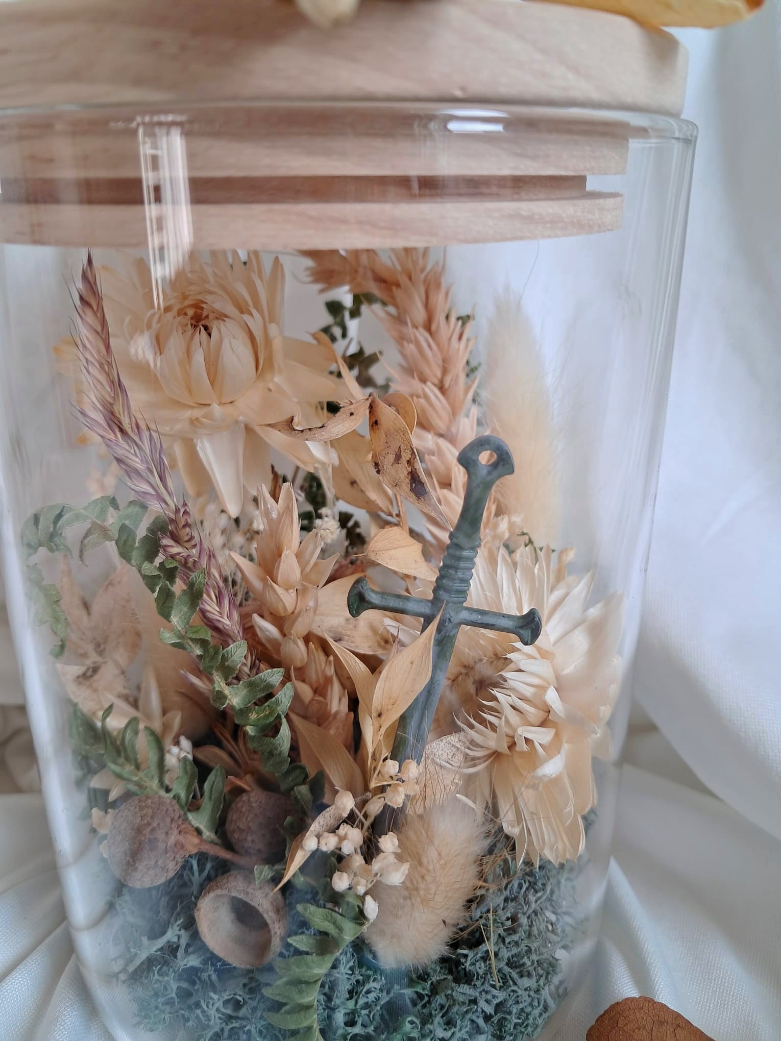 Un petit pot en verre renfermant fleurs séchées et épée, un monde fantastique qui n'attends que vous pour lui créer une histoire.