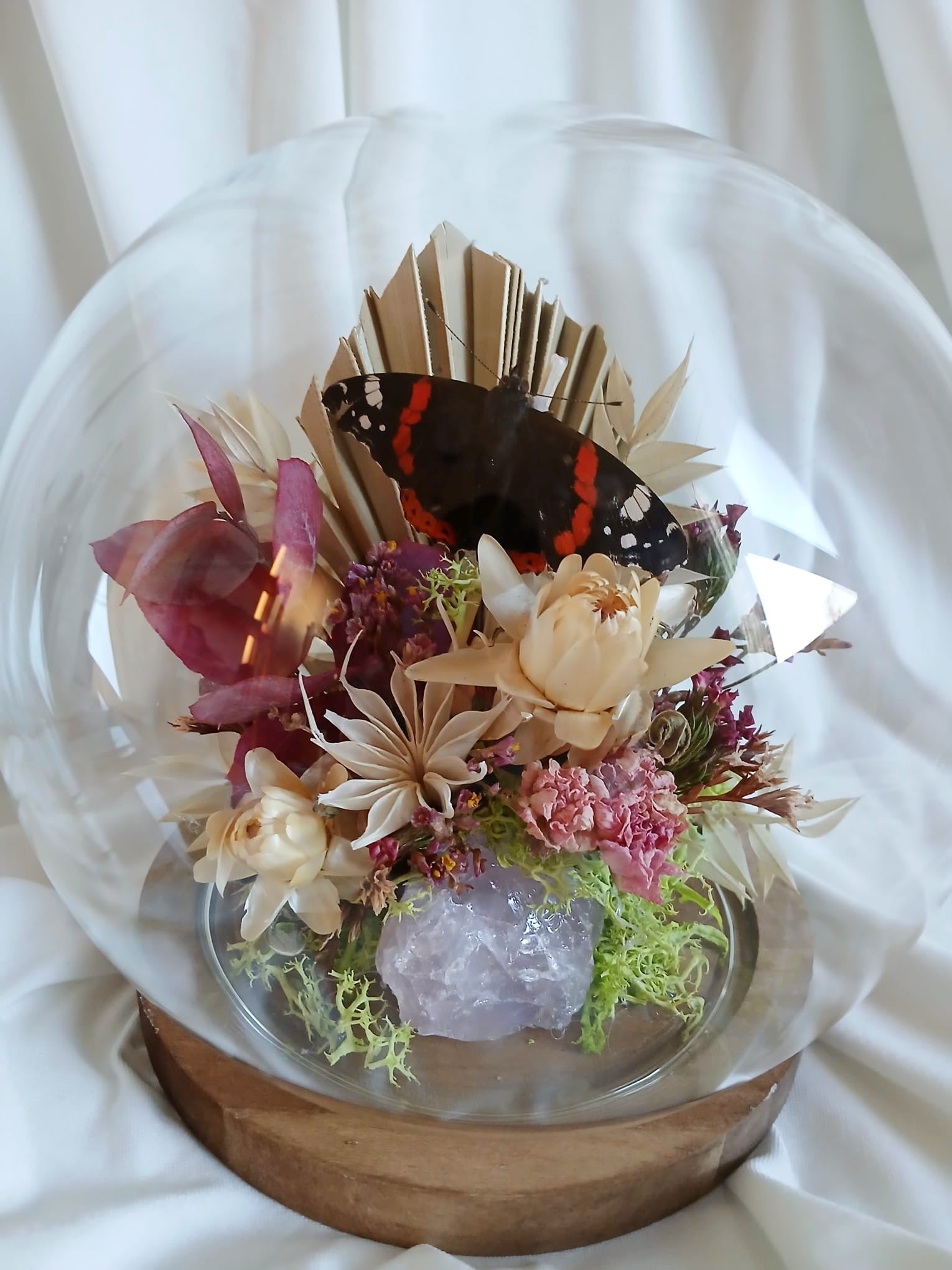 Globe en verre renfermant un papillon (trouvé dans mon jardin), des fleurs séchées et une pierre de quartz rose. Une composition féerique avec un brin de magie.