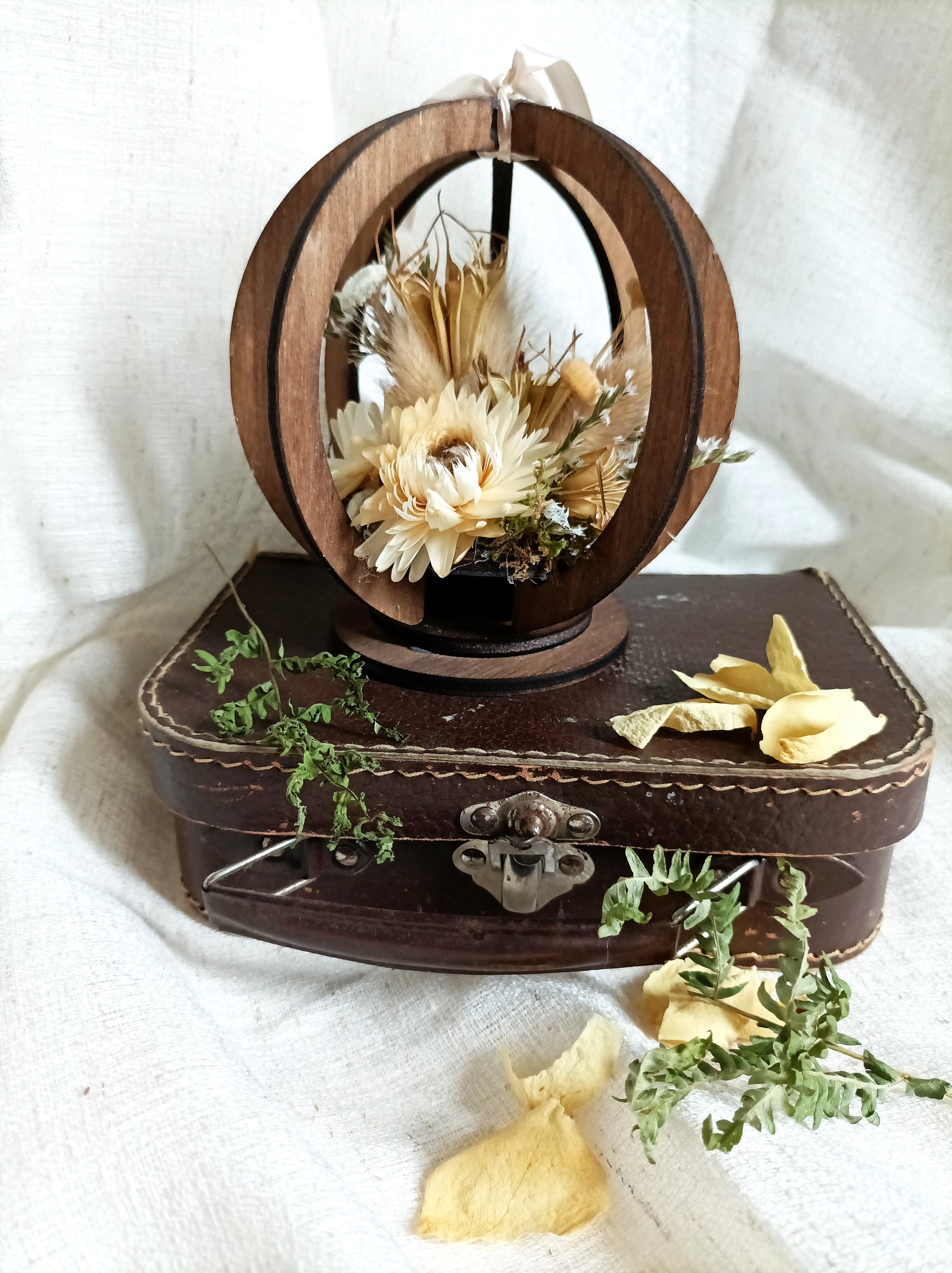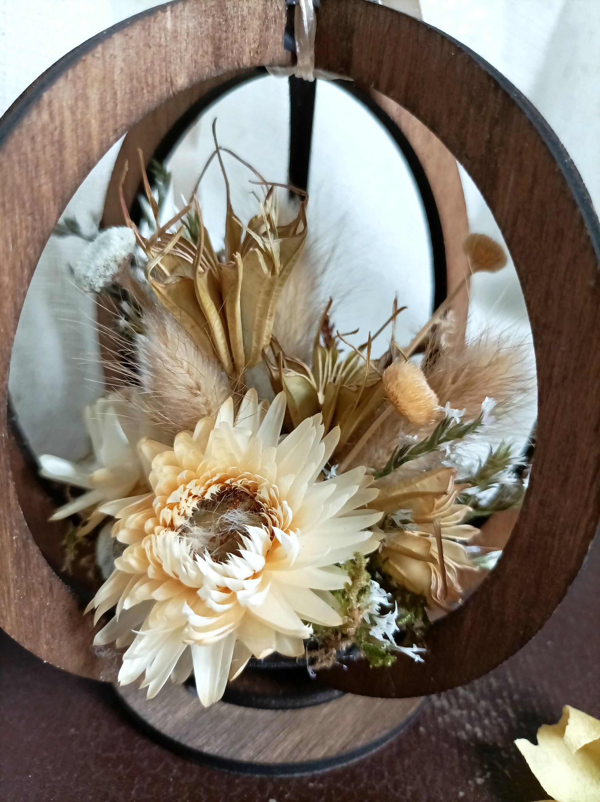 Suspension en bois réalisé à la main par mon conjoint et teintée. Une décoration multi-usages : elle peut être posée sur son socle, ou suspendue où vous le souhaitez! Quelle que soit l'occasion où la saison elle vous accompagnera.