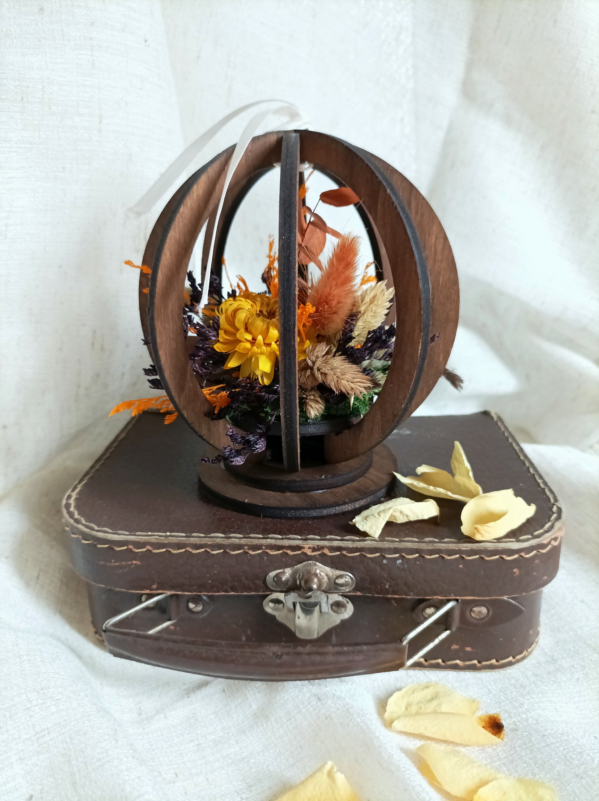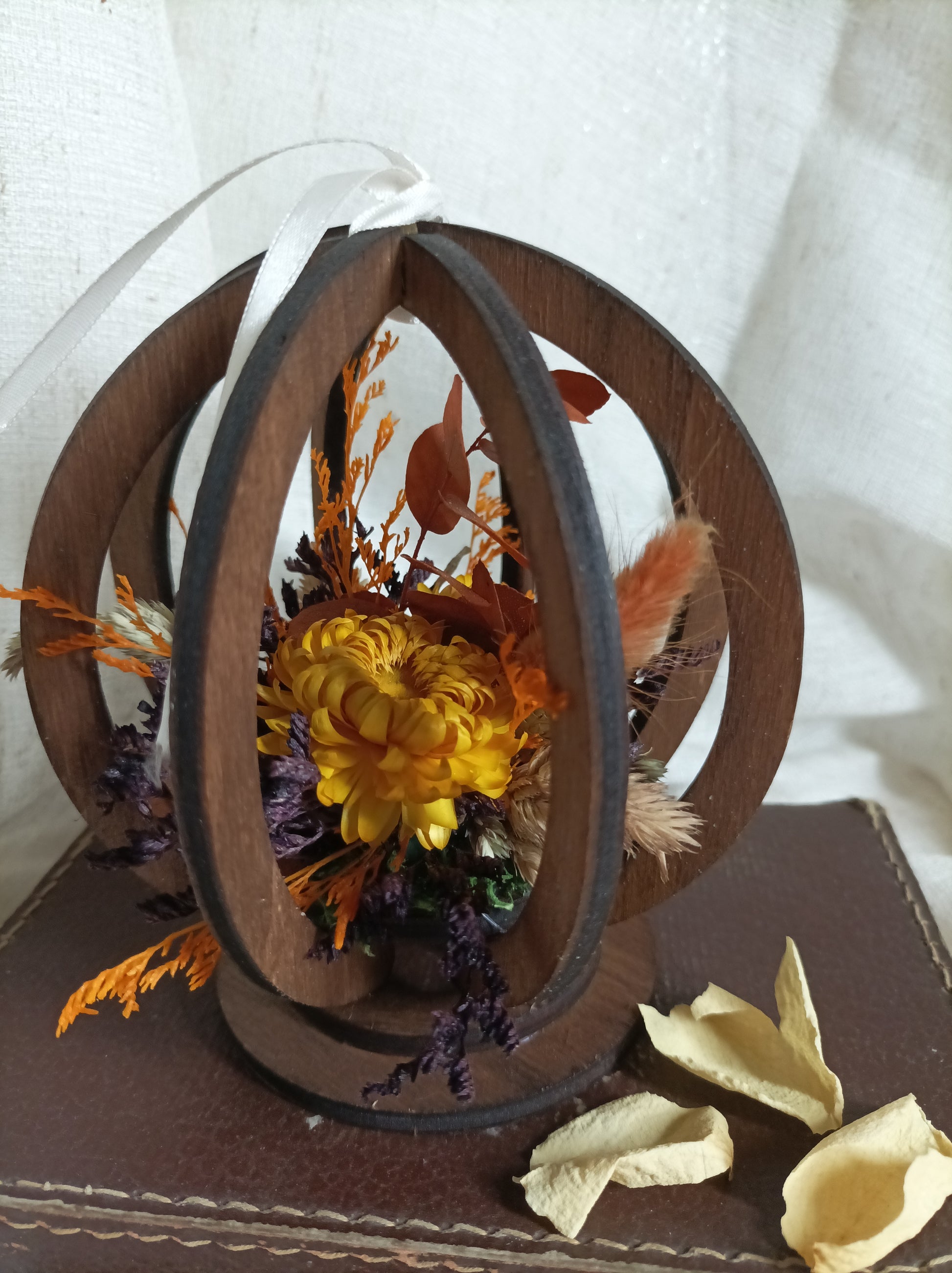 Suspension en bois réalisé à la main par mon conjoint et teintée. Une décoration multi-usages : elle peut être posée sur son socle, ou suspendue où vous le souhaitez! Quelle que soit l'occasion où la saison elle vous accompagnera.
