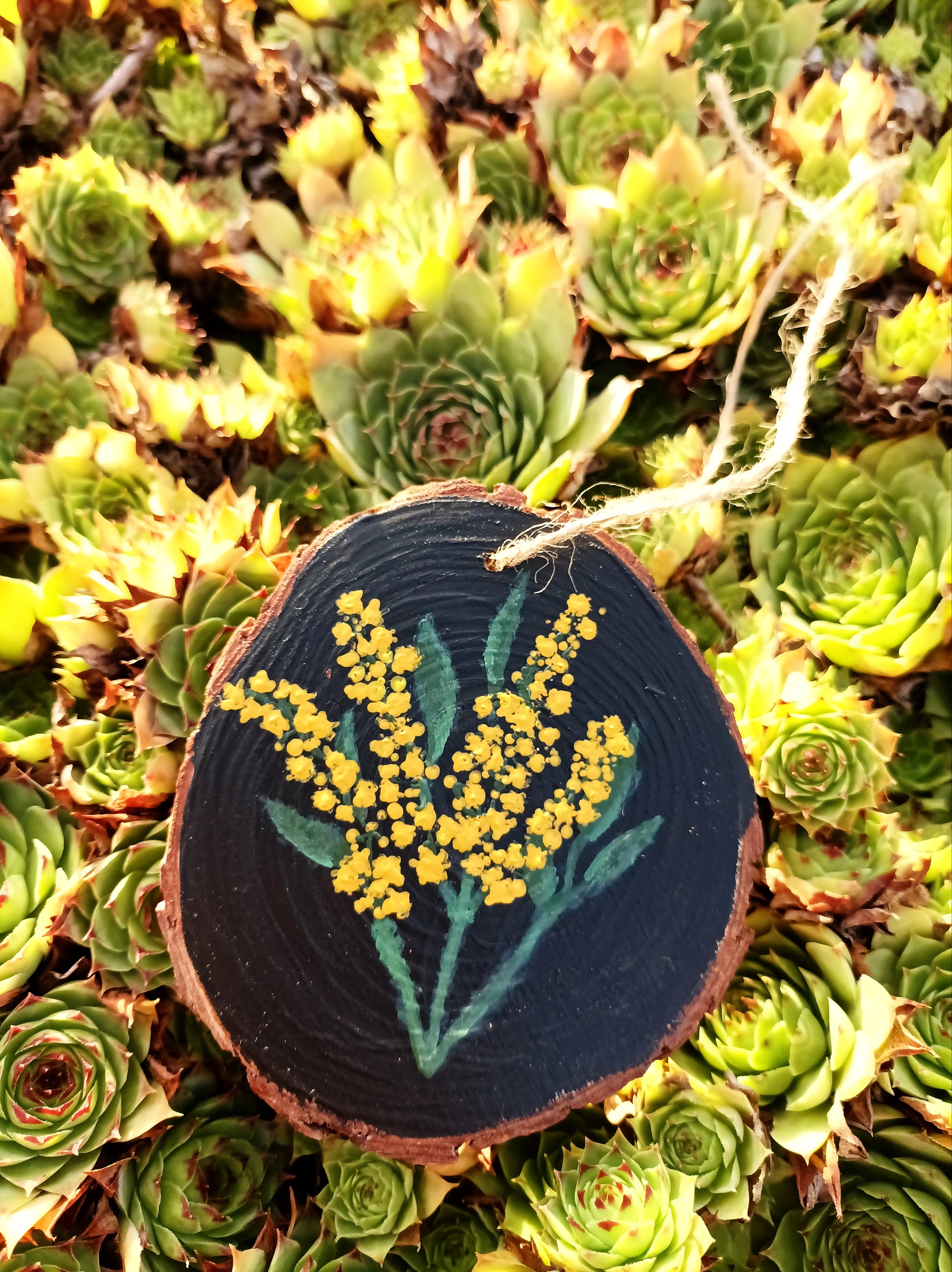 Motif mimosa peint, protégé par une couche de vernis.